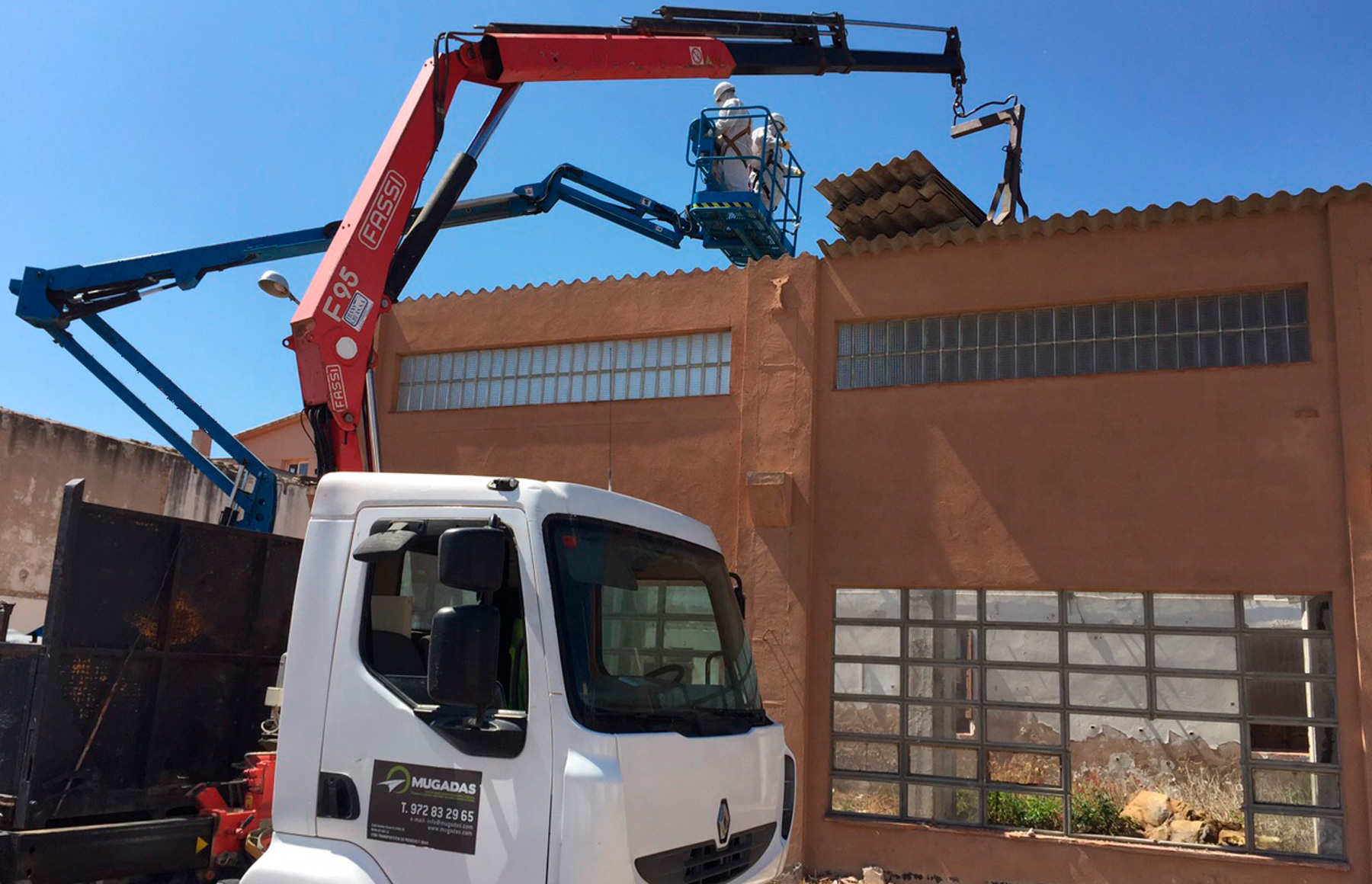 - Treballs de manipulació, extracció, empaquetament i transport d’amiant, contingut en plaques, bidons, teulades, baixants i amiant friable, seguint el protocol establert en la legislació vigent. Disposem de personal amb formació específica per aquest tipus de treballs, així com tot el material tècnic necessari: unitat de descontaminació, saques i embalatges homologats, EPI’s, etc...